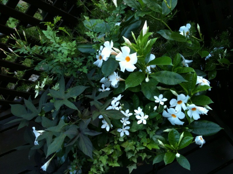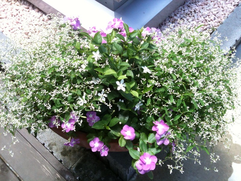 左の写真の寄せ植えはアングルの上に載っていて、イポメアがいい感じに絡んでるんです!