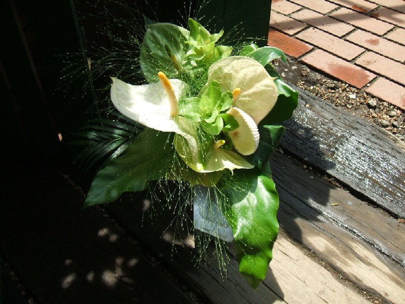 写真はアンスリウムとクルクマのエメラルドパゴダを使った花束。
