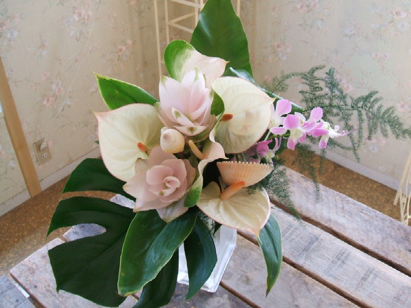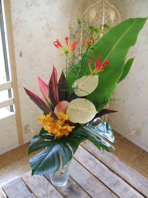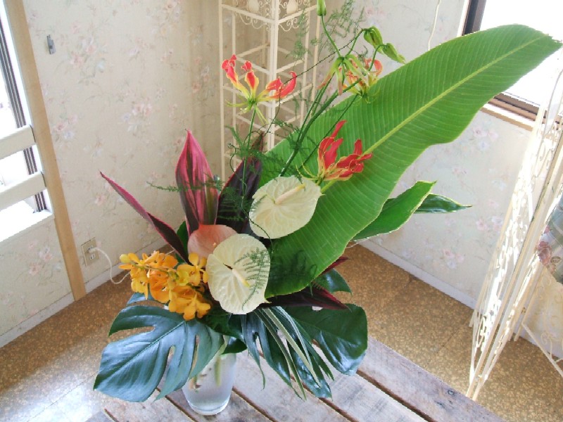 芭蕉の葉をメインにグロリオサ、アンス、モカラ、ドラセナ・・・・。