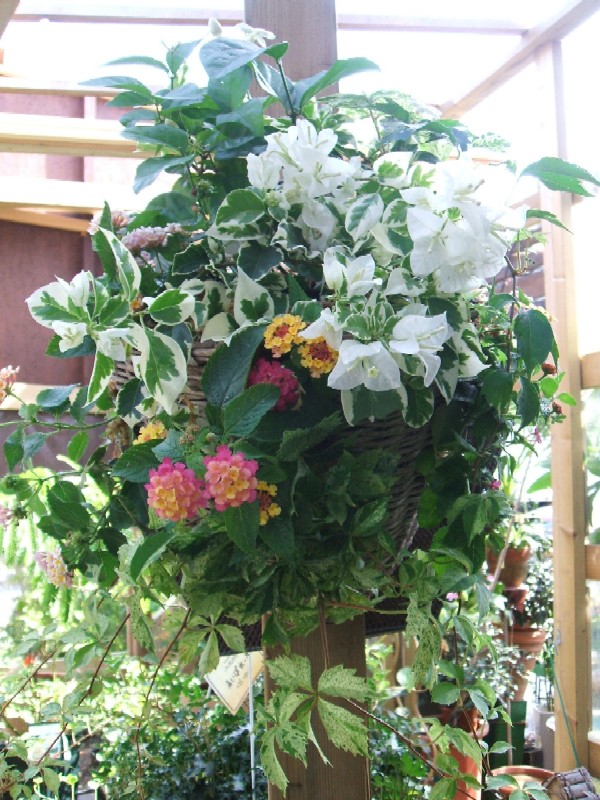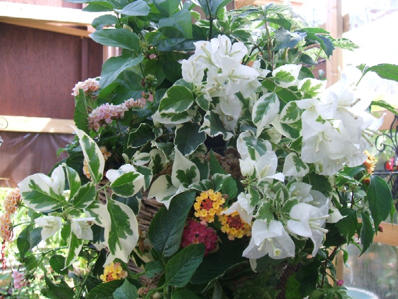 メインはブーゲンビレアのサンデリアーナホワイト、ピカケ、ランタナ、アメリヅタの斑入りです。