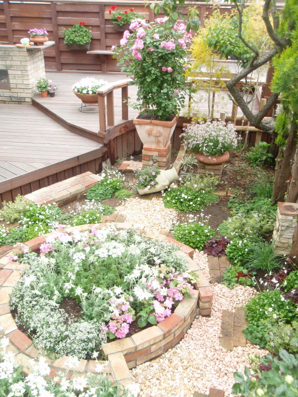 レンガで花壇や花台などレンガの色も微妙に変えて