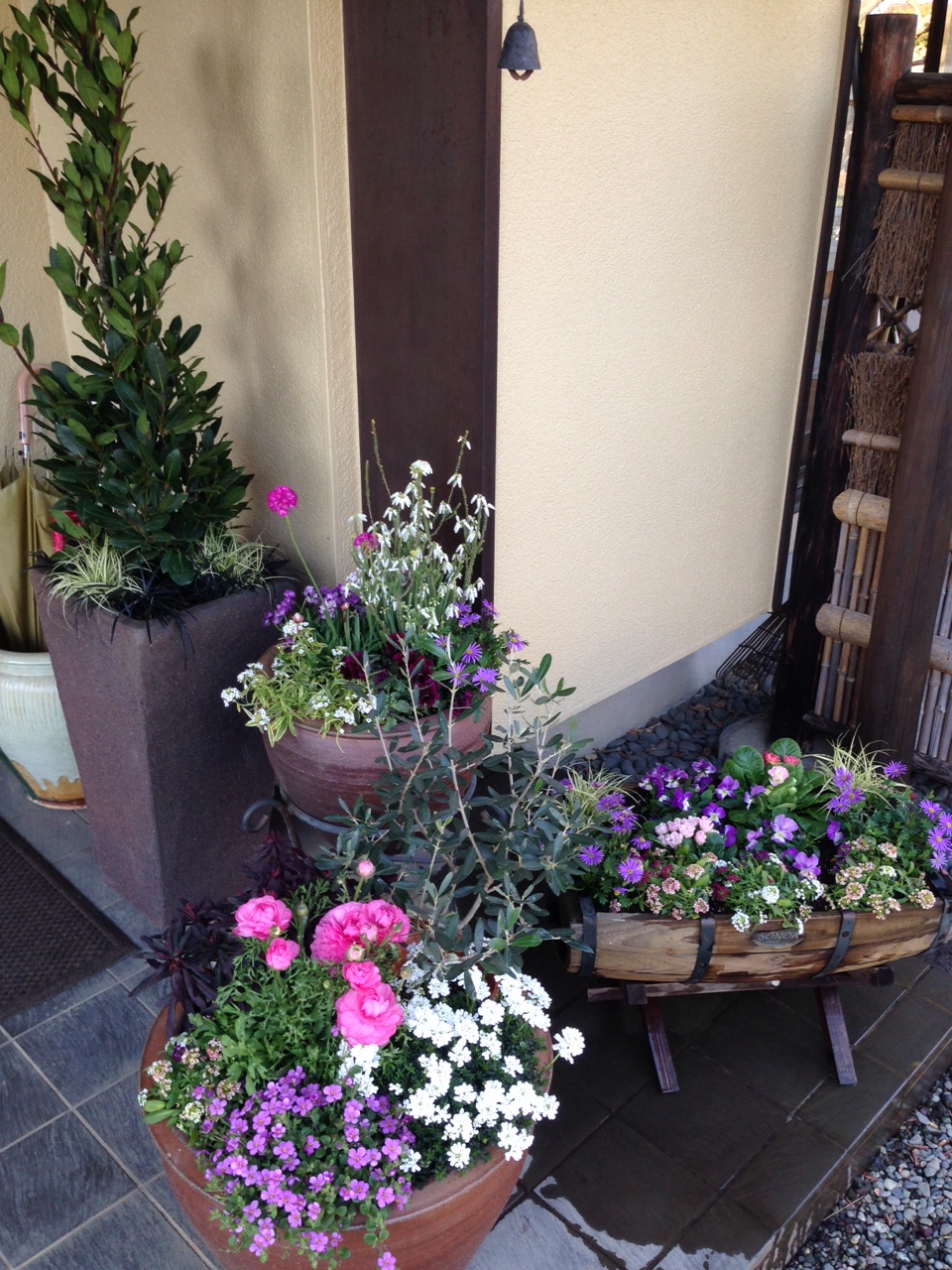 和風のお家にあわせて鉢を決め、華やかにお花を植えてみました。