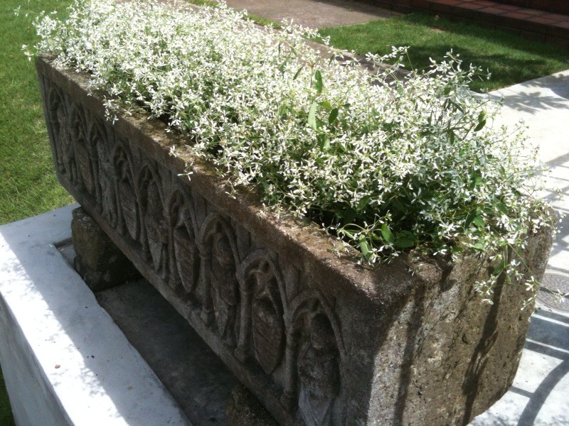 写真の石で出来たプランターが置いてあるんです。