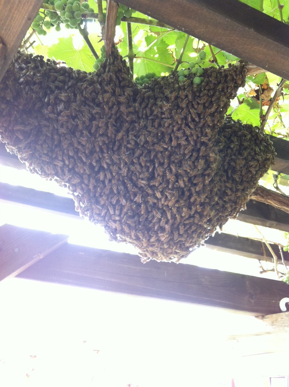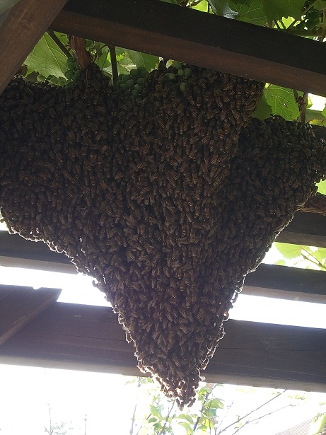 次第に数が減ったかと思うとお店のぶどう棚に蜂の塊が!