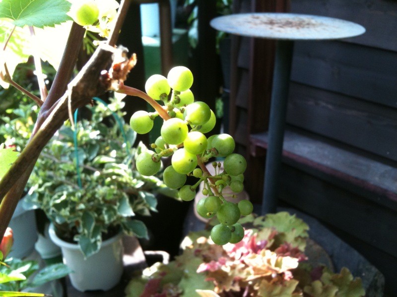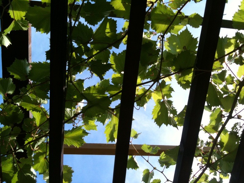 蔓がパーゴラ全体を覆いはじめました。来年はこの下で涼めるかな?